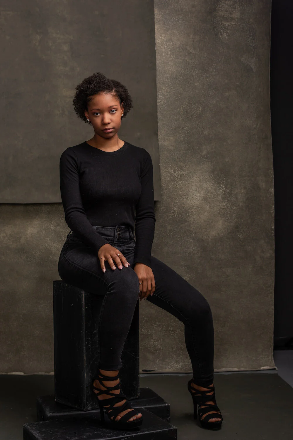Young black model sitting on a stool dressed in black in Sarasota Florida