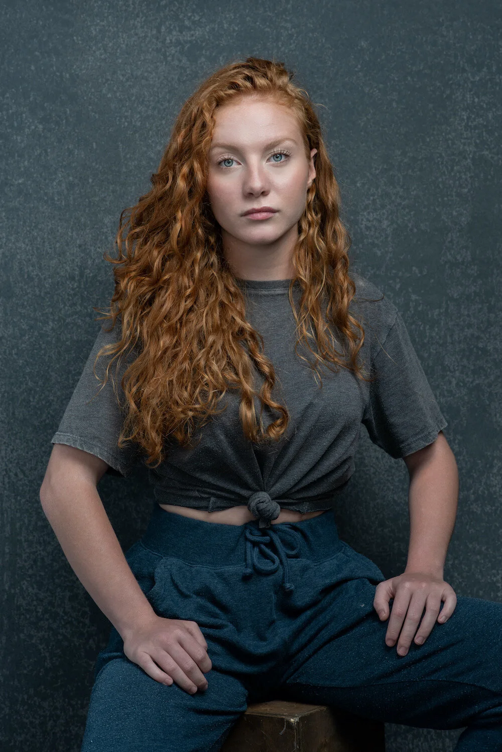 young red haired model in casual grey clothing sitting on a stool